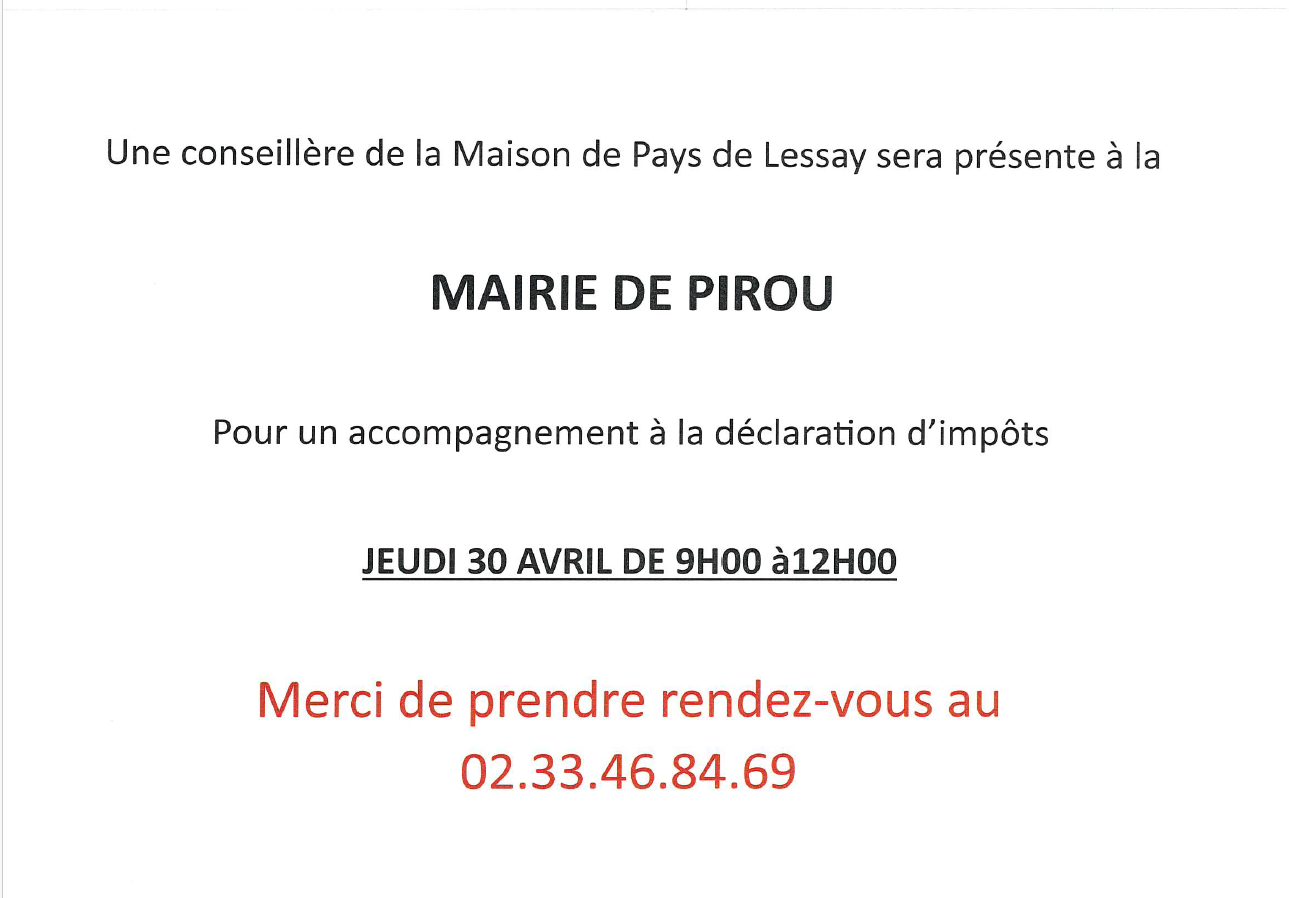 PERMANENCE LE 30 AVRIL A LA MAIRIE DE PIROU POUR UN ACCOMPAGNEMENT A LA DECLARATION D'IMPOTS