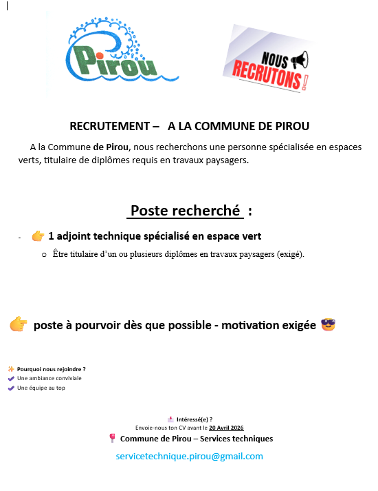 Le 03/04/2026 Offre d'emploi d'un adjoint technique spécialisé en espaces verts titulaire de diplômes en travaux paysagers exigés | |